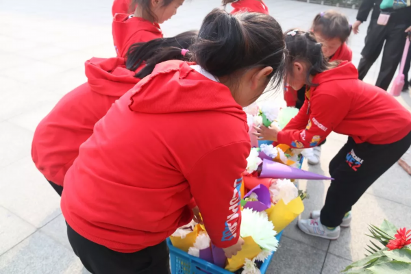 幼儿园小朋友在彭将军铜像前献上鲜花