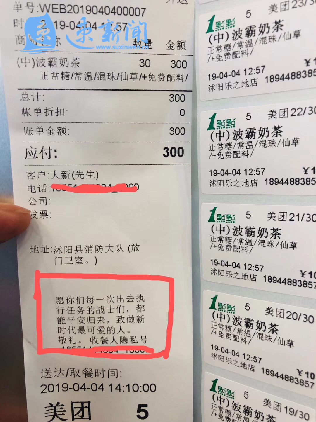 4月4日下午,一名外卖小哥给沭阳县消防大队的门卫室送去了30杯热气腾腾的奶茶,说是送给消防官兵的。门卫看见订单上有一串留言:愿你们每一次出去执行任务的战士们,都能平安归来,致做新时代最可爱的人。
