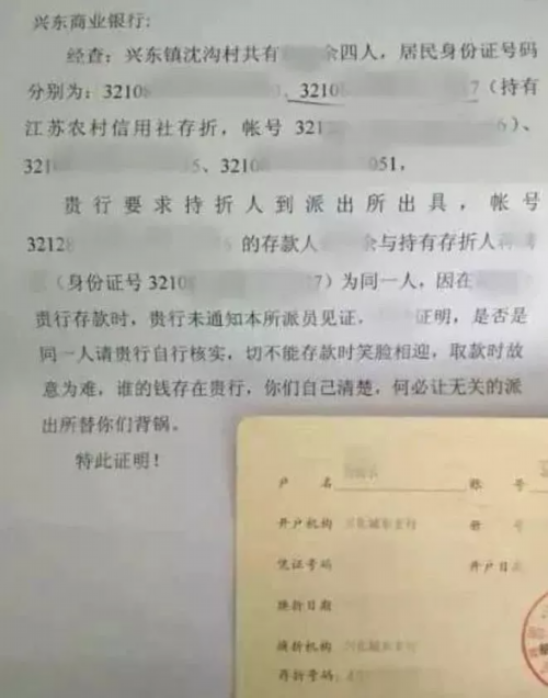 近日,兴化市兴东镇沈沟村一群众前往兴东镇某商业银行办业务时,被要求前往派出所开具“同一人”的证明,证明“我是我”。