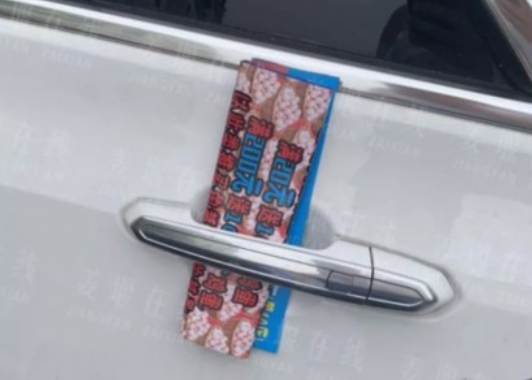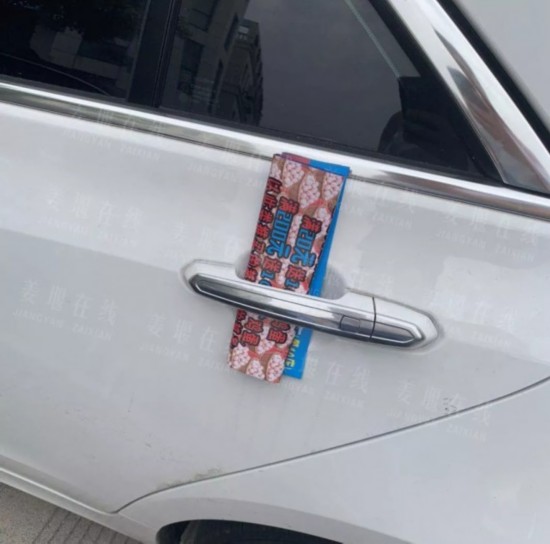 接报后,执法人员来到该小区,果然发现一些居民的轿车上插着小广告。