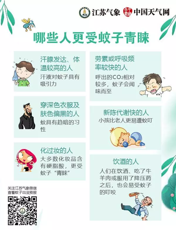 有实验证明,蚊子对呼吸频率较较快、出汗多、新陈代谢快、化浓妆以及经常喝酒吃肉的人“情有独钟”。另外,由于蚊子具有趋暗性,穿深色衣服及肤色偏黑的人比较招蚊子。