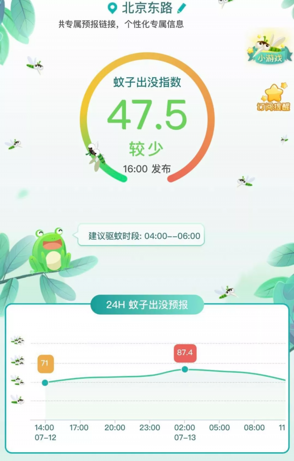 全国蚊子出没预报采用了全国智能网格实况分析产品和精细化预报产品作为技术支撑,将天气实况数据精确到每一个小时,范围涉及2.5公里。