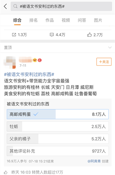 在一个微博博主发起的投票中,“高邮盐鸭蛋”获得了8.1万的票数。许多人表示,“高邮咸鸭蛋绝了”,“至今吃咸鸭蛋都只愿意吃高邮的”,“读那篇课文总是偷偷咽口水,明明我不喜欢咸鸭蛋的”……