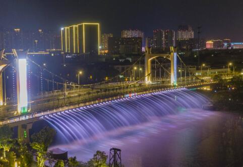 景观灯投射在水幕之上,变幻出紫、红、蓝、粉等多种色彩,炫目迷人,成为市民消暑纳凉的好去处。
