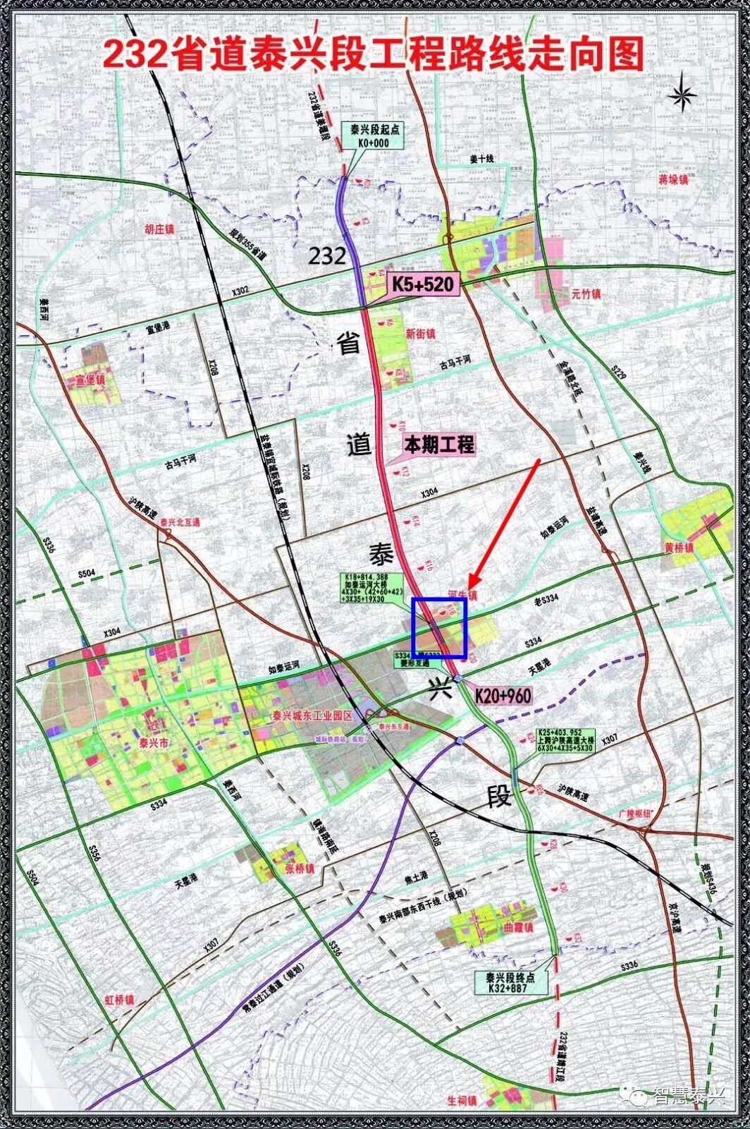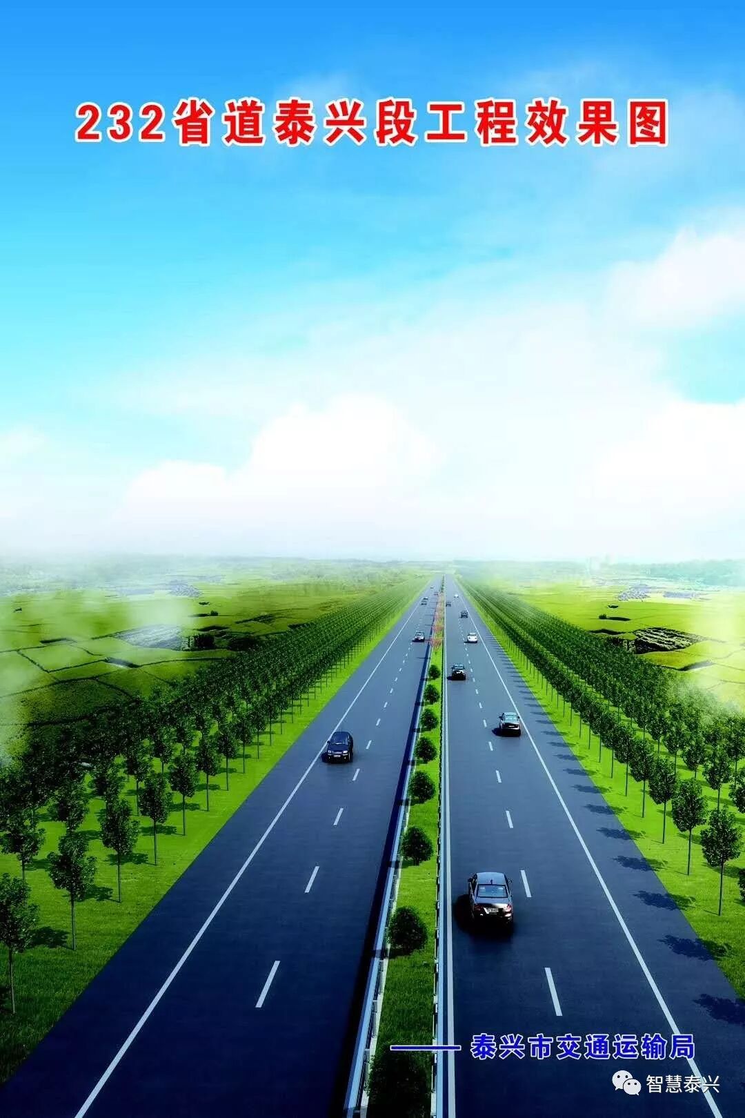 232省道是新一轮省道路网规划中连接苏北、苏中、苏南的纵向干线公路。232省道泰兴段,途经新街、根思、黄桥、河失、曲霞、广陵六个乡镇,总长约32.9公里,其中新建约30.64公里,利用老路约2.26公里,路基宽25.5米,两块板双向四车道一级公路标准,概算总投资约21.6亿元,同步实施绿化、安保等配套工程。