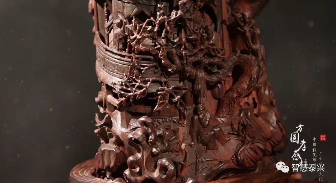小叶紫檀色泽从深黑到红棕,变幻多样,纹理细密,雕刻团队巧妙根据木材形状,中空部分雕成山沟、流水、瀑布;凸出处雕成山石、松柏、飞鸟等;柱顶端还雕了一座凉亭,一对老伴端坐亭中悠闲饮茶,细腻的纹理,对精细刻画人物神态带来了极大的方便,将众多人物的喜、怒、哀、乐,浓缩在一米多高的紫檀木柱上。