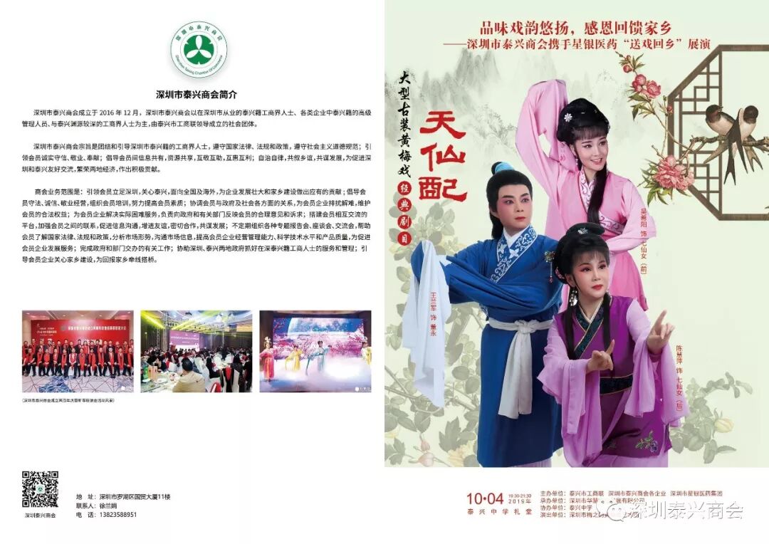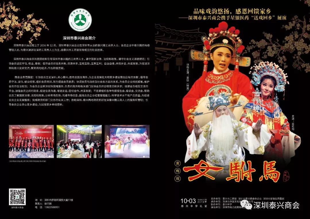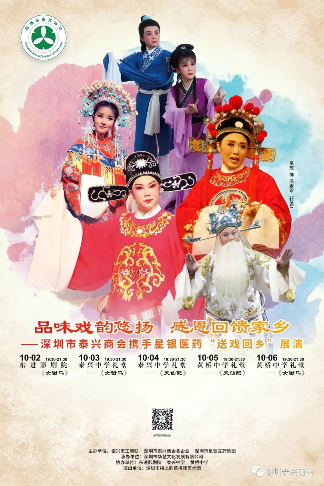 由泰兴市工商联、深圳市泰兴商会、深圳市星银医药集团主办,深圳市华慧文化发展有限公司承办,东进影剧院、泰兴中学、黄桥中学协办,深圳市龙岗区梅之韵黄梅戏艺术团演出的“品味戏韵悠扬,感恩回馈家乡——深圳市泰兴商会携手星银医药‘送戏回乡’”活动将在国庆节期间10月2-6日演出五场全本大戏,与家乡人民共同欢庆建国七十周年。