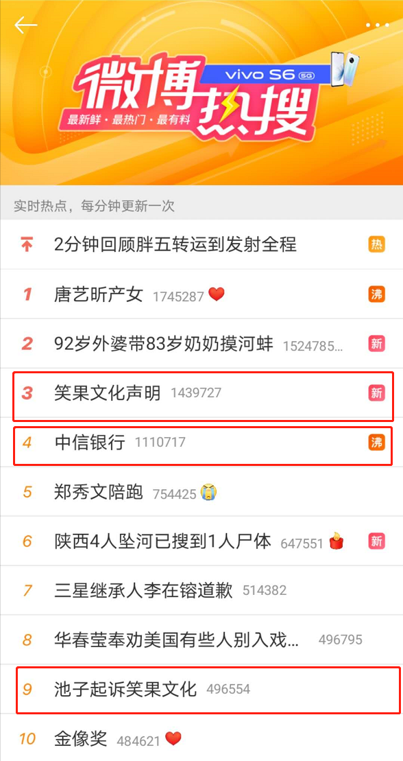 不久后,“池子起诉笑果文化”“ 笑果文化声明”“中信银行”纷纷登上热搜榜,数月来的矛盾进入白热化阶段。