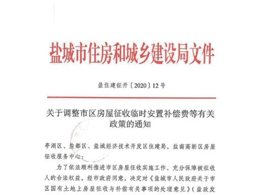 近日,盐城市住建局发出通知:调整市区临时安置补偿费等有关政策。