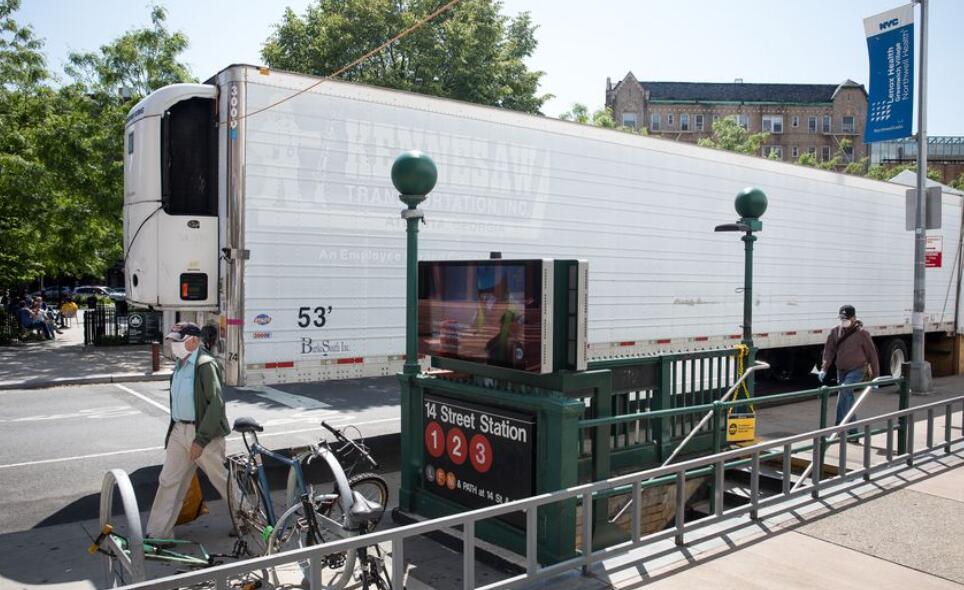 Pedestrians wearing face masks pass by a temporary morgue parked in front of Lenox Health Greenwich Village during the COVID-19 pandemic in New York, the United States, May 26, 2020. (Photo by Michael Nagle/Xinhua)