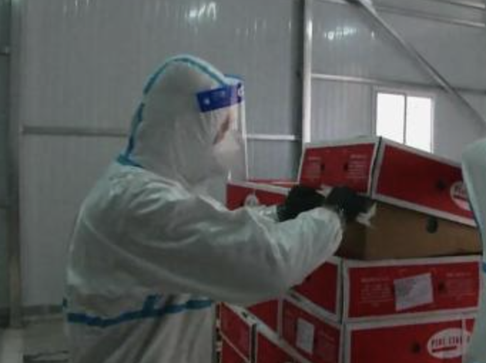 验明“正身”,确保手续合规后,工作人员对车辆进行整体消杀,并开舱卸货,对每一箱冷链食品全方位消杀。待静置30分钟后,开始采样核酸检测。一系列工作完成后,该批食品才得以正式进仓。