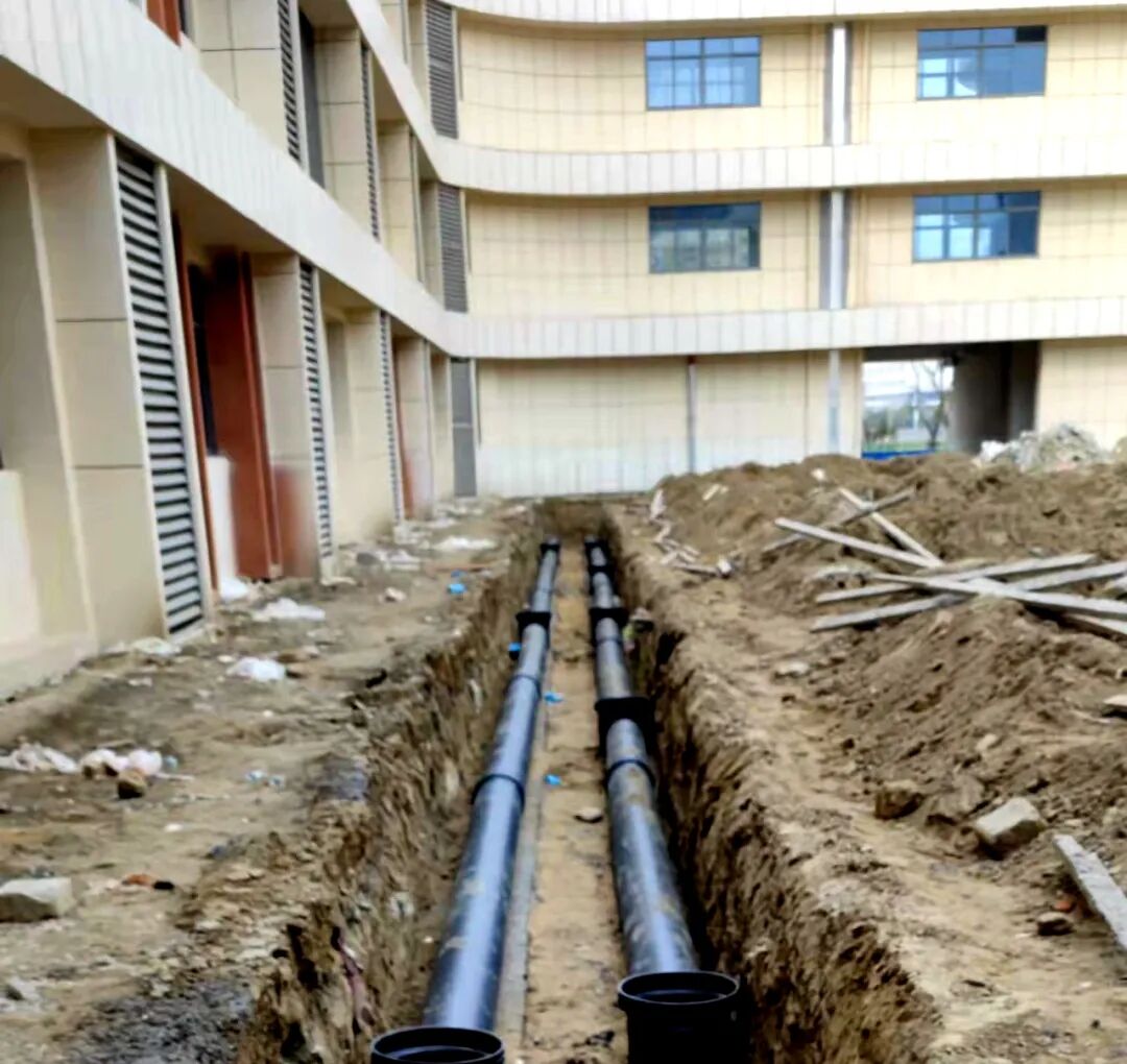 项目目前正在对土建工程细部处理,室外雨污水施工接入北侧商井路主网,智能化和厨房设备同步施工等工作。