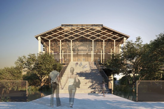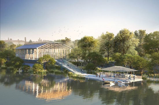 把原有的水上飞机坡道改造成大型城市台阶,作为通往河上户外活动的通道,将外部的浮动平台,用作室外咖啡馆或酒吧。除此之外,保留原有建筑周围的树木,让树木将建筑与城市隔离开,打造出一片“离城不离尘”的乐土,满足本地市民和游客的需求。