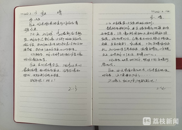 每天的日记不算长,读起来像“流水账”,却真实记录了抗疫一线的辛劳和点滴进展。“2月17日,木渎镇第2轮全员核酸采样,下午抽空回到社区安排各小区物业加强管控”“18日,早上7点30分到各个小区检查防控宣传广播是否全部响起来,14点至22点木渎镇第3轮全员核酸采样,采样结束整理好已是深夜11点半”“19日,今天去天平花园,小区的封闭管理、公共场所病毒消杀。在业委会的配合下,做得都还行,大家对防控工作也都挺有信心的”……