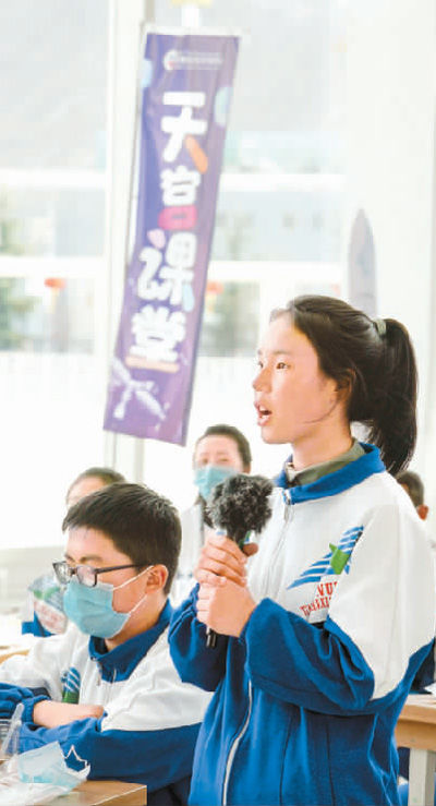 3月23日,位于“天宫课堂”西藏拉萨地面分课堂的学生向航天员老师提问。新华社记者 晋美多吉摄