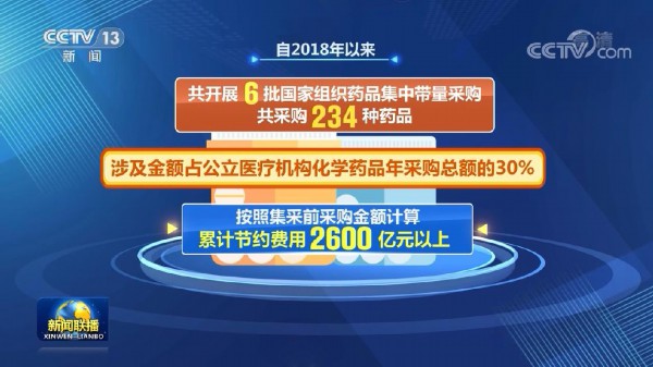 自2018年以来,共开展6批国家组织药品集中带量采购,共采购234种药品,涉及金额占公立医疗机构化学药品年采购总额的30%,按照集采前采购金额计算,累计节约费用2600亿元以上。