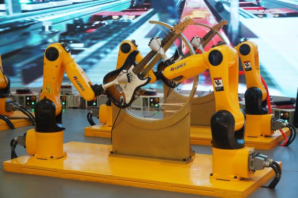 在位于赣州市的格力小镇,机器人乐队正在演奏音乐(2月18日摄)。新华社记者万象摄