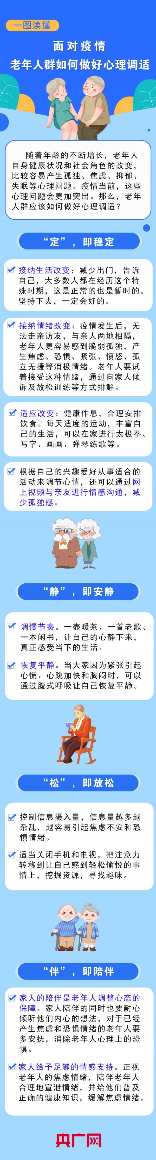 随着年龄的增长,老年人的自身健康状况和社会角色都在改变,比较容易产生孤独、焦虑、抑郁、失眠等心理问题。疫情当前,这些心理问题会更加突出,那么,老年人应如何做好心理调适呢?