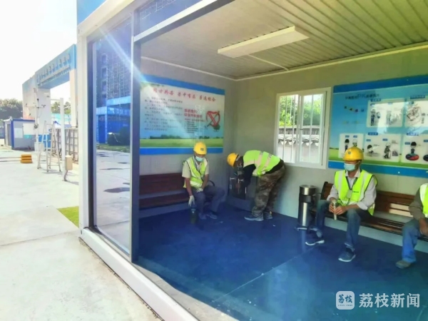 临时休息区用于施工现场工人在施工作业期间休息、补水等。该区域设有取水器、休息椅、空调,为农民工提供舒适的施工休息环境。