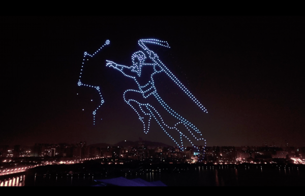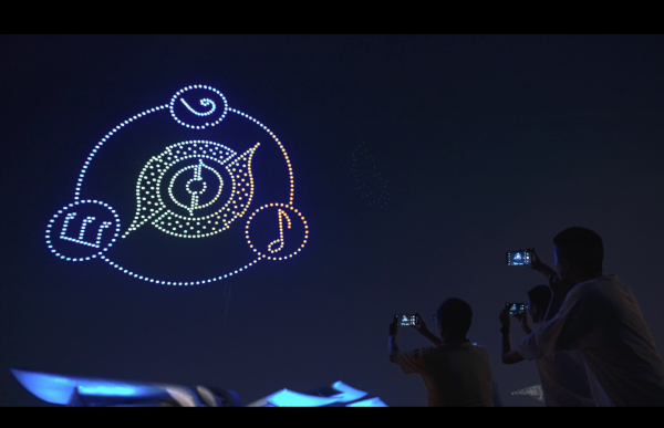 伴随着无人机阵型不断变换,天空中相继出现“曜”“李白”“庄周”“公孙离”等《摘星辰》音乐剧中人物中国原创数字IP形象的表演画面,让观看者进入独一无二的东方幻想世界。
