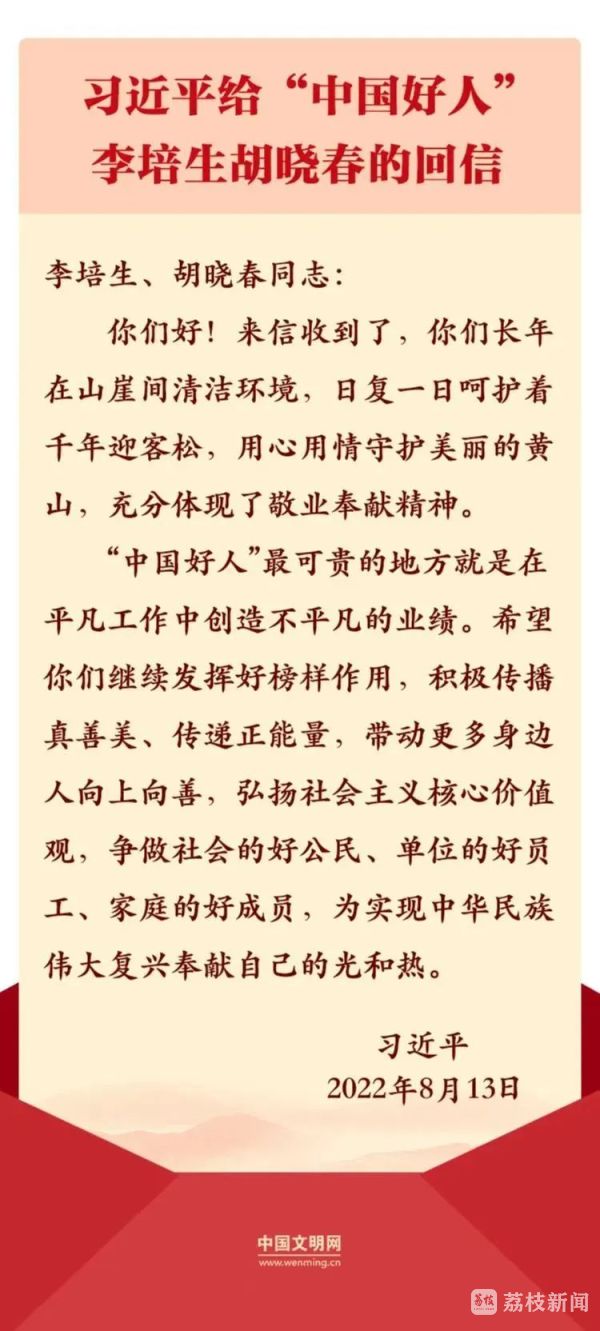 8月13日,中共中央总书记、国家主席、中央军委主席习近平给安徽黄山风景区工作人员李培生、胡晓春回信,对他们继续发挥“中国好人”榜样作用提出殷切期望。