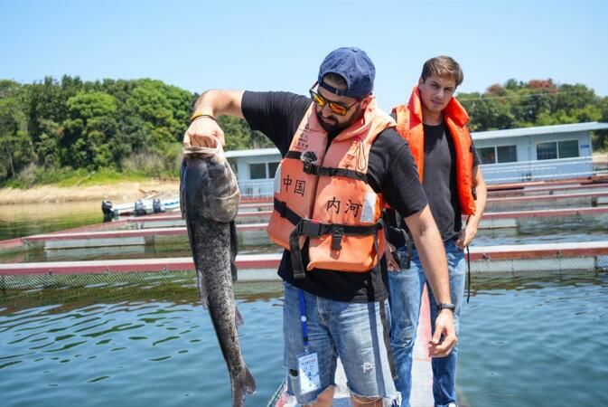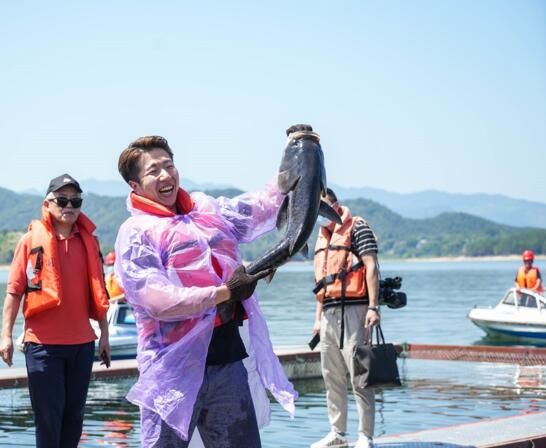 韩国网红博主金峻范展示在花亭湖捕获的鳙鱼 摄影 高迈