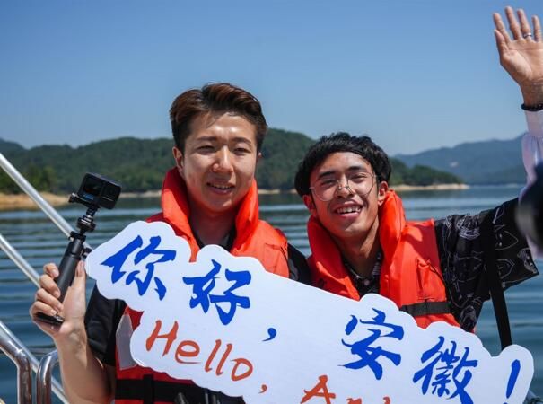 国际在线安徽消息(查宛昕):9月6日,2022“打卡中国·最美地标——你好,安徽!” 网络国际传播活动在安徽省安庆市拉开序幕。从“千重山色,万顷波光”的花亭湖到以山峦起伏、擎天一柱闻名天下的天柱山,来自克罗地亚、意大利、韩国、墨西哥、菲律宾、俄罗斯、南非、西班牙等国家的网红博主们乘花亭湖游船、捕捞鳙鱼、爬天柱山,亲身体验长江孕育的皖江文化。