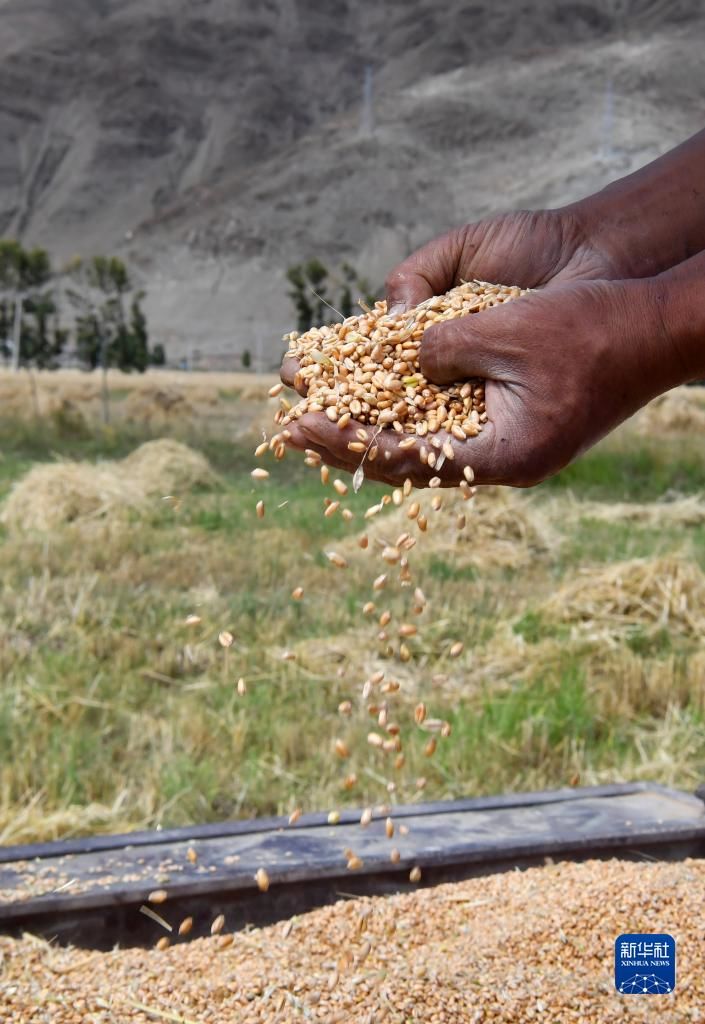 林周县边林乡当杰村玉冲组的村民在检查收获的小麦(9月6日摄)。