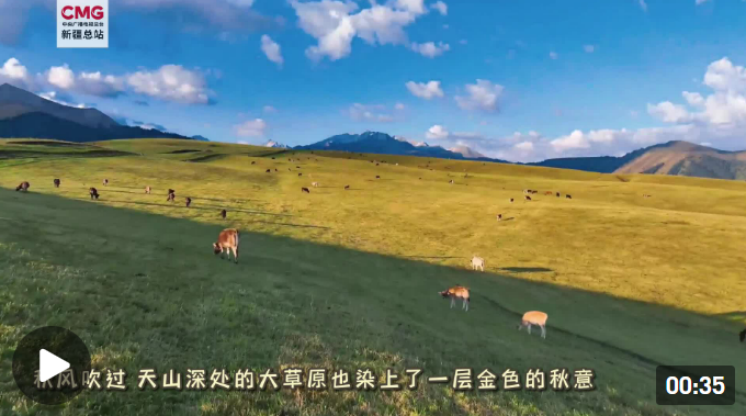 秋风吹过,新疆天山深处的大草原也染上了一层秋意,深绿与鹅黄交织的草原高低起伏,羊肥马壮,犹如一幅流动的金色画卷。