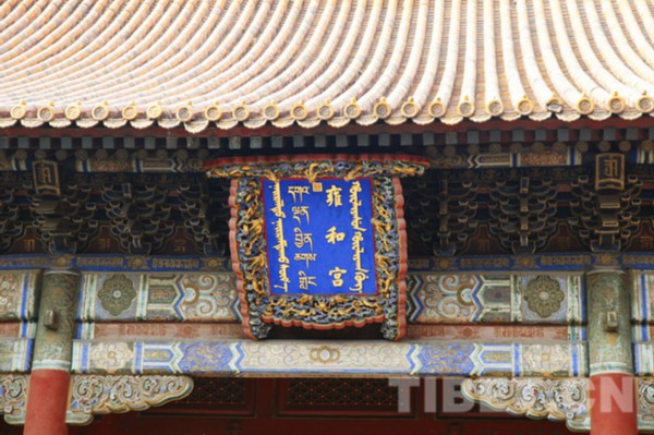 图为雍和宫大殿匾额,从右至左,以满文、汉文、藏文、蒙古文书写“雍和宫” 摄影:李元梅