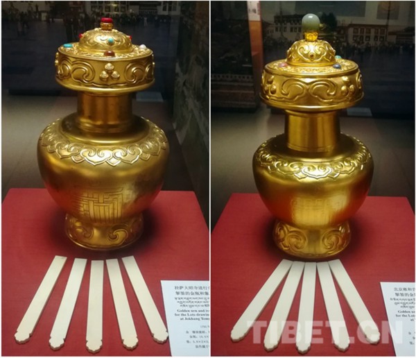 图左为大昭寺进行金瓶掣签的金瓶和象牙签(复制品),图右为雍和宫进行金瓶掣签的金瓶和象牙签(复制品)摄影:李元梅