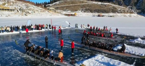 在天山天池景区,4.9平方公里的湖面已全部结冰,当地利用冰面举办的冰上龙舟活动了吸引了不少游客前来参与游览。