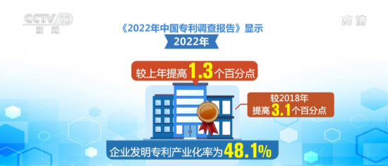 《报告》显示,2022年,我国有效发明专利产业化率为36.7%,较上年提高1.3个百分点。其中,企业发明专利产业化率为48.1%,较上年提高1.3个百分点,较2018年提高3.1个百分点。