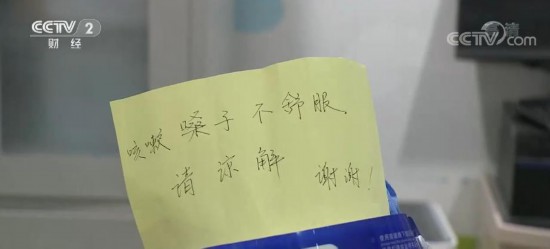 夜里12时,值夜班的护士已经换班上岗。记者在分诊台发现,一位医护人员的面罩上面插着一张纸,上面写着:“咳嗽、嗓子不舒服,请见谅,谢谢!”记者想要采访,却被她拒绝了。了解后才知道,这位护士身体还没有恢复就来上班,不太想让家人知道。