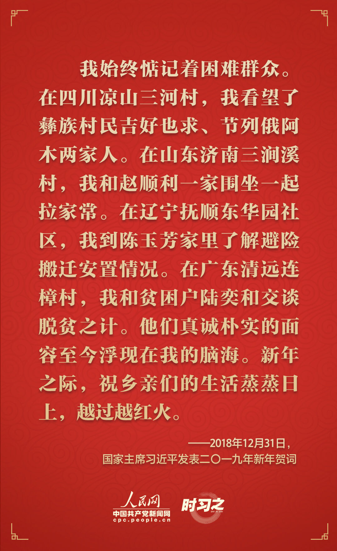 2022年12月31日晚,国家主席习近平将发表二〇二三年新年贺词。在历年的新年贺词中,习近平主席心系民生冷暖、情牵万家灯火,体现着大国领袖深厚的人民情怀。人民网·中国共产党新闻网“时习之”栏目带您一起重温习近平主席的新年贺词,感悟“人民”二字重逾千钧。