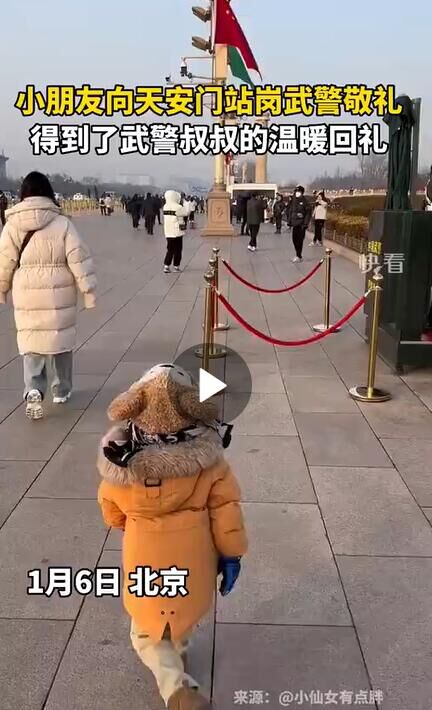 1月6日,北京,一位小朋友蹦蹦跳跳到天安门站岗武警面前,立刻收脚立正敬礼,得到了武警叔叔的温暖回礼。网友:一个是榜样一个是未来。
