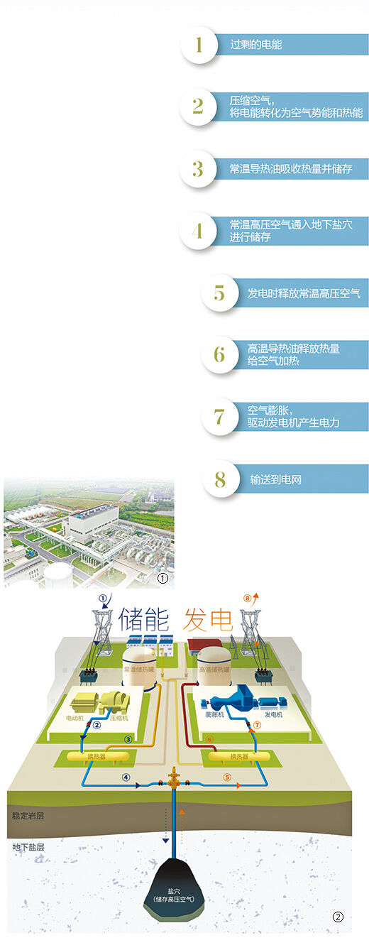 “在用电低谷时把空气压缩,存储在地下盐穴,完成一次充电的周期为8小时;在用电高峰时,释放高压空气,每小时能发电6万千瓦时,可以连续发电5个小时,发电量可达30万千瓦时。”韩月峰介绍。