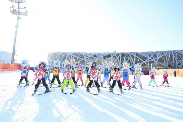 A group of children pose for a photo at the opening of an ice and snow sports carnival in front of the National Stadium ("Bird's Nest") in Beijing, Jan. 18, 2023. [Photo courtesy of Beijing State-owned Assets Management Co. Ltd.]