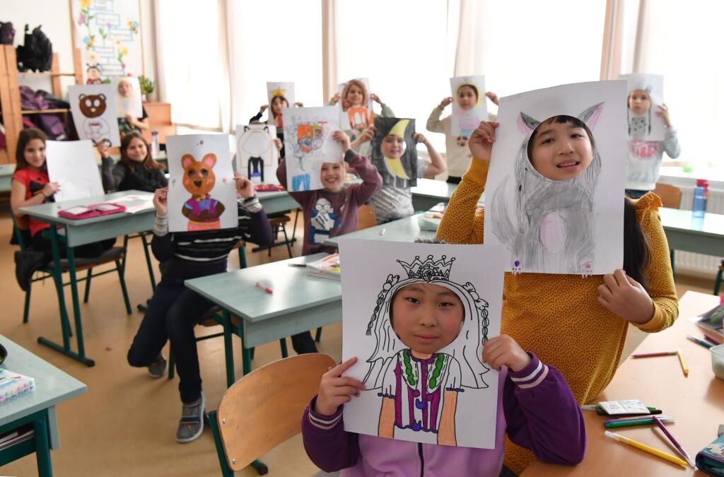 在匈牙利布达佩斯的匈中双语学校,学生们在画画课上展示自己的画作。