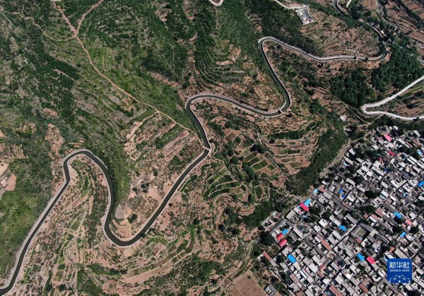 青山环抱的陕西省延安市延川县文安驿镇梁家河村(2019年8月12日摄,无人机照片)。新华社记者 陶明 摄