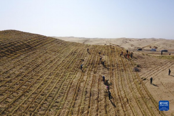 在甘肃省武威市古浪县北部沙区旱麻岗治沙点,八步沙林场治沙人和群众一起扎草方格压沙(2020年3月6日摄,无人机照片)。新华社记者 范培珅 摄