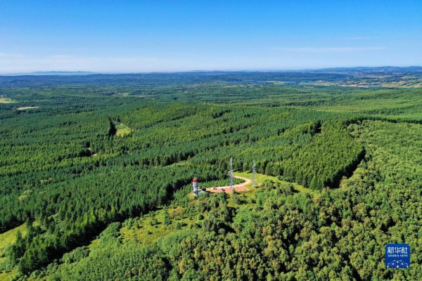 这是2021年8月23日拍摄的河北塞罕坝机械林场内的望海楼(无人机照片)。新华社记者 牟宇 摄