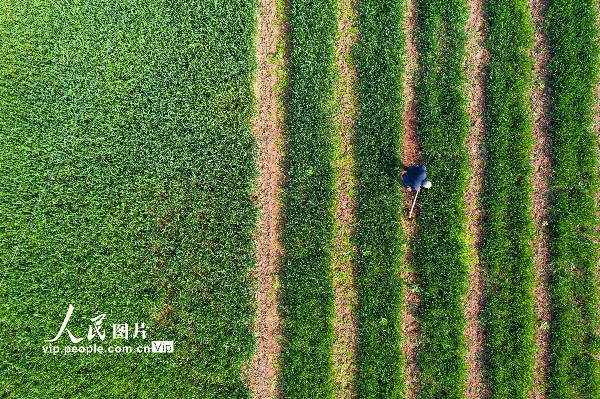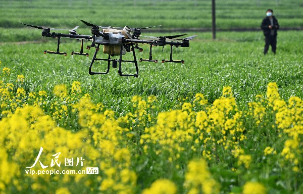 2023年2月25日,四川省南充市蓬安县睦坝镇武胜村,工作人员操控植保无人机在麦田喷洒农药。刘永红摄(人民图片网)