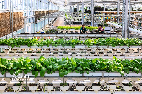 2023年2月26日,在四川省泸州市江阳区现代农业园区的高科技温室种植大棚内,工人们忙着养护栽种的蔬菜。张若涵摄(人民图片网)