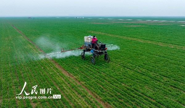 2023年2月25日,河南省驻马店市西平县老王坡高标准农田,农民正在驾驶农机设备喷洒农药。赵永涛摄(人民图片网)