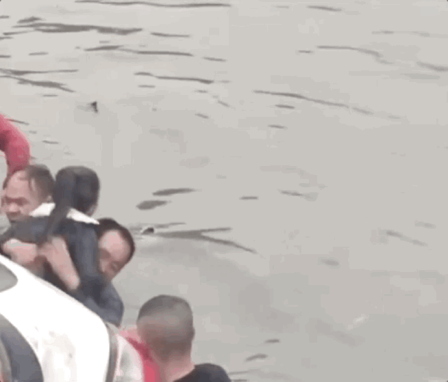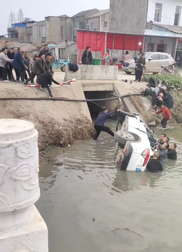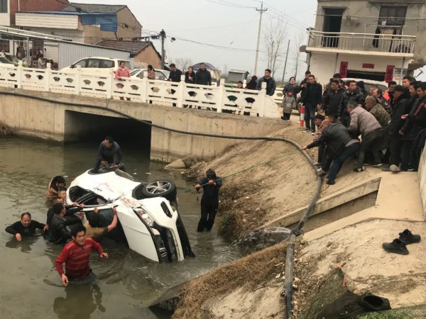 “快来救人呀,车子掉水里了!”