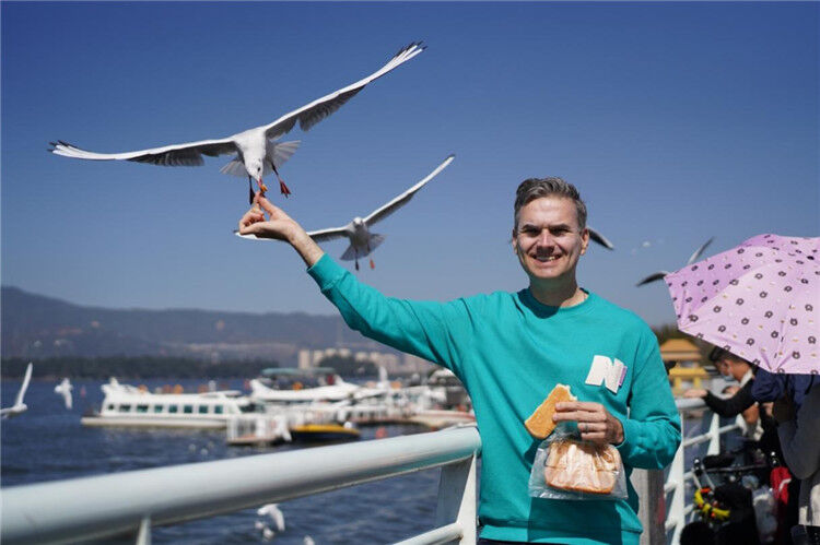 杜安睿在云南昆明滇池边喂海鸥。受访者供图