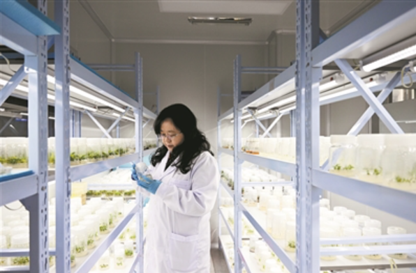 中科院合肥物质科学研究院智能机械研究所党委书记、副所长吴丽芳在植物组织培养间观察组培苗的长势。新华社记者 黄博涵摄