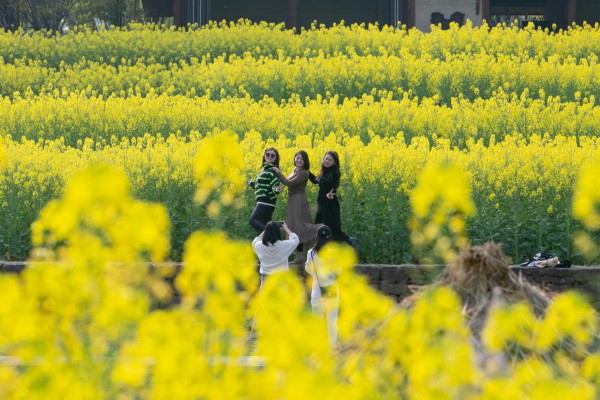3月8日,游客在重庆广阳岛的油菜花田前合影。新华社记者储加音 摄