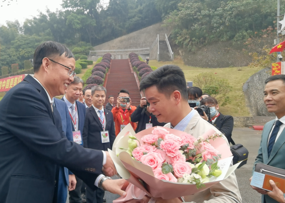 中方工作人员给越南游客送上鲜花。新华社记者梁舜 摄